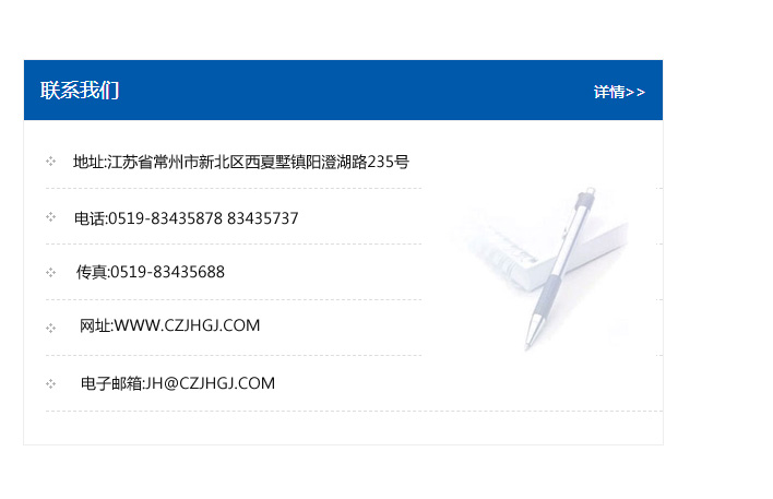 地址:常州市新北區友邦商務大廈1幢16、17層  電話:0519-85101652  傳真:0519-85112595  郵編:213022  網址:www.cz-jiayue_cn.sxmzcq.com  郵箱:xiajifengaa@163.com